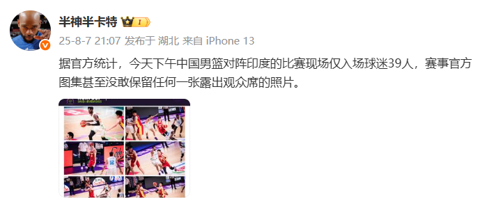 “据官方统计,今天下午中国男篮对阵印度的比赛现场仅入场球迷39人,赛事官方图集甚至没敢保留任何一张露出观众席的照片。”该媒体人在社媒上写道。